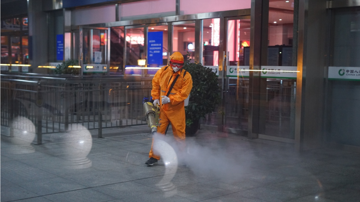 呂有谷和隊(duì)友們戴著背負(fù)式彌霧器一起上陣,在動(dòng)車(chē)站大廳、售票處、衛(wèi)生間等區(qū)域進(jìn)行了全方位、無(wú)死角消毒滅茵。在近兩個(gè)小時(shí)的消毒作業(yè)過(guò)程中,防