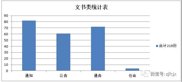 公司所有的文書類如:通知、通告、公告、任命等統一有正規格式,經編輯、審核、批準,統一由總裁辦渠道發布。經對2018年文書類統計,各類發布如下:通知82份、公告61份、通告72份、任命4份,合計共發布文書類219份。
