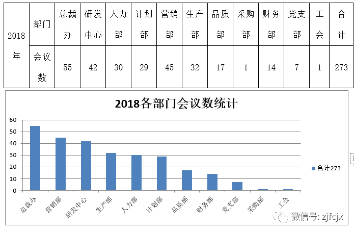 根據《公司會議管理制度》規定要求,各部門需用到公司會議室的會議需以《會議通知》的形式到總裁辦進行登記,同時以《會議紀要》的形式到總裁辦進行備案。經2018年各部門到總裁辦會議數統計如下: