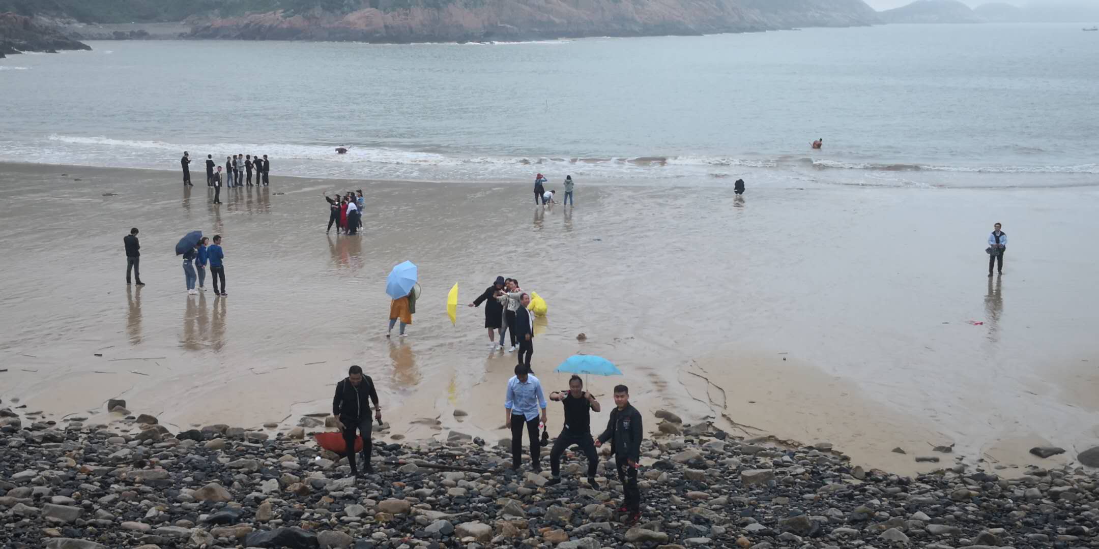 中轉(zhuǎn)站我們定在了大坑沙的沙灘上。這是一片幾乎被遺忘的原生態(tài)沙灘。沙灘的兩側(cè)是飽受海水侵蝕的礁石,形態(tài)各異。黑白相間的鵝軟石占據(jù)了這片沙灘。到時(shí)正趕上潮平似退未退時(shí),在平坦結(jié)實(shí)的沙灘上走一走,迎面而來的潮水似進(jìn)又退,不知不覺中也跟著他的步子,一步步走向大海,在潮水中嬉戲。不一會,天空下起了雨,似有留客的意思。