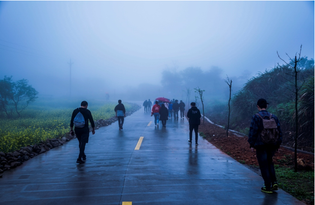 在各組成員吃飽喝足充滿能量之后 ,開始了此次活動最高潮部分——暴走。在開始暴走之前,參加暴走的全體成員在自行車協(xié)會牌前集合進(jìn)行了合影留念,之后開始了暴走活動。天氣依然是跟早上一樣,三米開外的地方,似乎什么都看不清了,天空中也下著蒙蒙細(xì)雨,但一點(diǎn)也不影響我們的心情。大家一邊歡快地聊著天,一邊向上地攀登者。享受著霧蒙蒙的風(fēng)景,在這詩情畫意中繼續(xù)著。很快我們從平坦的水泥路轉(zhuǎn)到了泥濘的山路中。疊翠的峰巒、茂密的森林和曲折盤旋的山路讓我們不禁陶醉其中,盡情領(lǐng)略大自然的風(fēng)情。各個部門之間都彼此相互鼓勵、相互協(xié)助,不斷挑戰(zhàn)著自己。